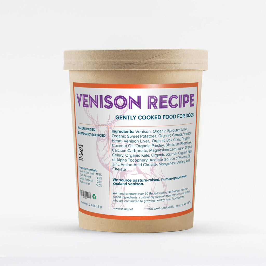 Venison, Organic Sprouted Millet, Organic Sweet Potatoes, Organic Carrots, Venison Heart, Venison Liver, Organic Bok Choy, Organic Coconut Oil, Organic Parsley, Dicalcium Phosphate, Calcium Magnesium Carbonate, Organic Celery, Organic Kale, Organic Squash, Organic Kelp, Vitamin E, Zinc Chelate, Manganese Chelate
