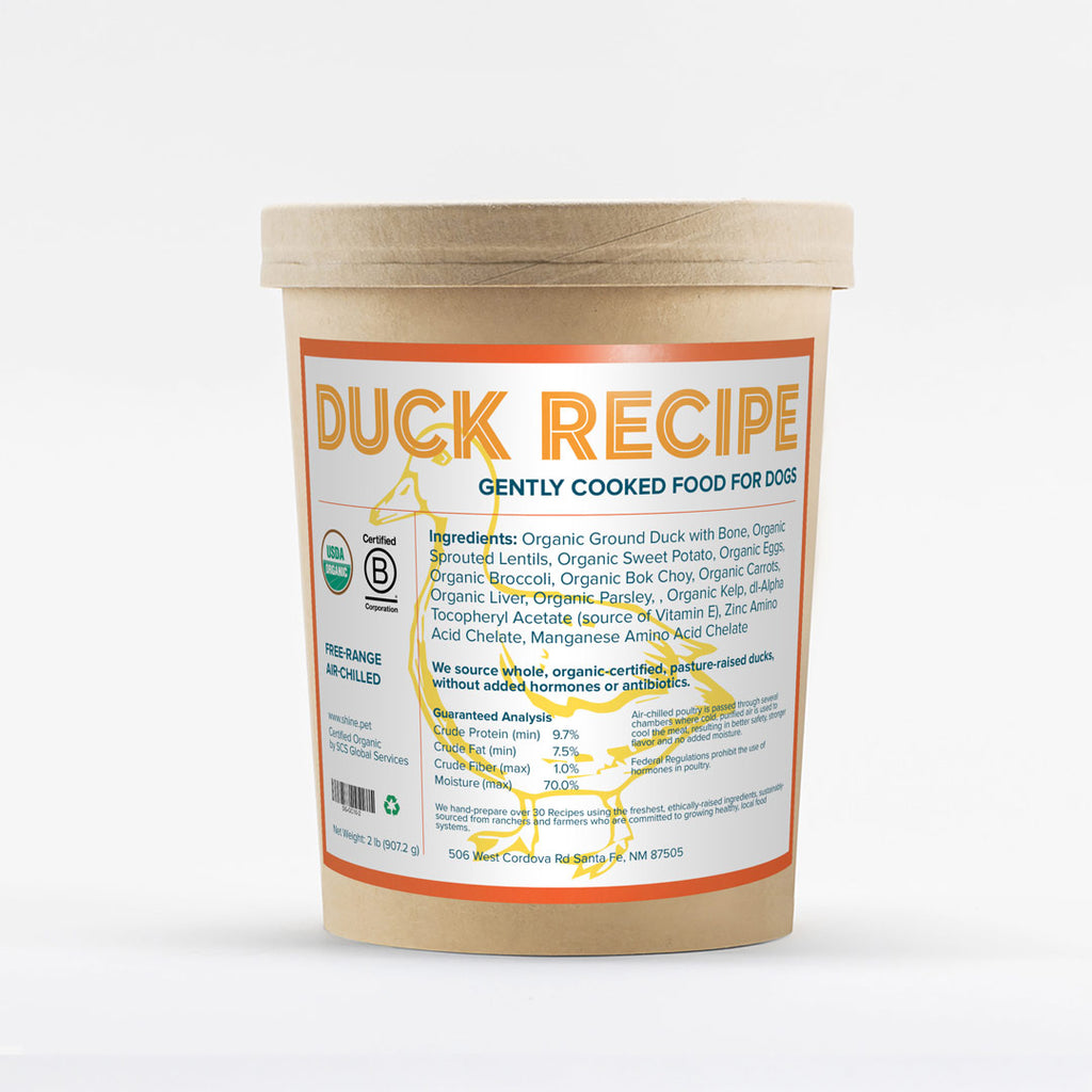 Organic Ground Duck with Bone, Organic Sprouted Lentils, Organic Sweet Potato, Organic Eggs, Organic Broccoli, Organic Bok Choy, Organic Carrots, Organic Liver, Organic Parsley, Organic Kelp Vitamin E, Zinc Chelate, Manganese Chelate